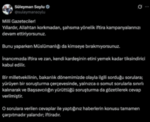 “Bilesiniz… Öteki dünyada hesabınız ağır olacaktır. Allah doğruların yanındadır” diyen Soylu şunları yazdı: Milli Gazeteciler! Yıllardır, Allahtan korkmadan, şahsıma yönelik iftira kampanyalarınızı devam ettiriyorsunuz. Bunu yaparken Müslümanlığı da kimseye bırakmıyorsunuz. İnancımızda iftira ve zan, kendi kardeşinin etini yemek kadar tiksindirici kabul edilir.
