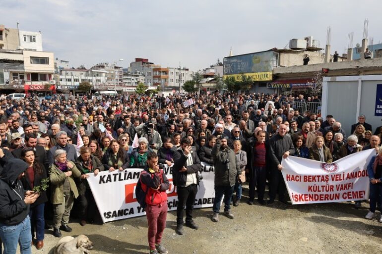 Hatay’ın Samandağ ilçesinde Alevi kurumları, “Suriye’de soykırıma dur de” sloganıyla 75’nci Yıl Parkı’nda miting düzenledi.