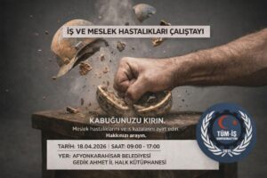 Tüm İş Konfederasyonu, “Görünmez Kırımı Durduracağız, Kabuğumuzu Kıracağız” başlığıyla Afyonkarahisar’da İşçi Sağlığı ve Meslek Hastalıkları Çalıştayı düzenleyecek. Çalıştay 18 Nisan 2026 Cumartesi günü 09.00–17.00 saatleri arasında yapılacak.