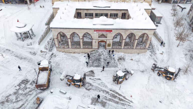 Ekipler, cami avlusunda biriken karları iş makineleriyle şehir dışına taşıdı.
