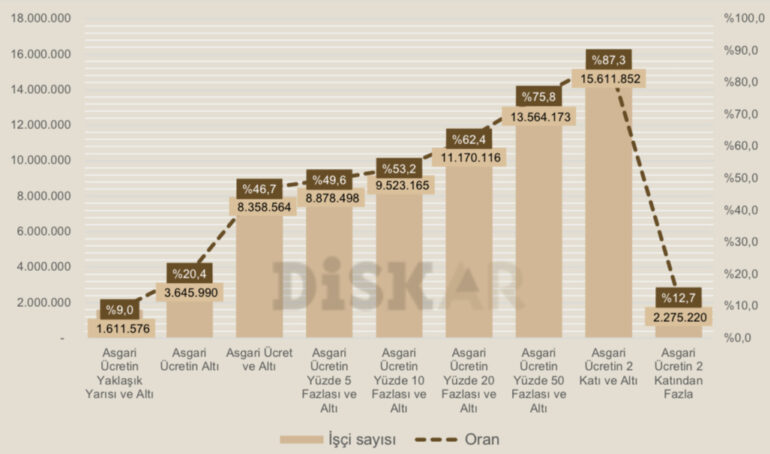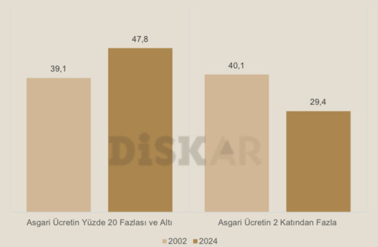 2009 ve 2024 yılları arasında asgari ücretin yüzde 5, yüzde 10 ile yüzde 20 fazlası ve altında bir ücretle çalışanların oranı ciddi biçimde artış göstermiş. 2009’da yüzde 28 olan asgari ücretin yüzde 5 fazlası ve altında ücret alanların oranı 2024’te yüzde 49.6’ya; 2009’da asgari ücretin yüzde 10 fazlası ve altında ücret alanların oranı 2024’te yüzde 53.2’ye ve 2009’da yüzde 52.8 olan asgari ücretin yüzde 20 fazlası ve altında ücret alanların oranı 2024’te yüzde 62.5 seviyesine gelmiş. Bu tablo, özel sektörde ücretlerin asgari ücrete sıkıştırıldığı ve asgari ücret kapsamının son 15 yılda genişlediğini gösteriyor.